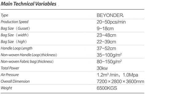 The beyonderis our latest design. It can directly forming nonwoven or nonwovenwith laminated box type bag with handle loop automatically. The finished bagnoneed reverse. It has high effciency, less workers, lowproduction cost, repeateduse. ltmainlyforproduction oftobacco wine bags, soft drinking packagingbags,giftbags, advertising bags andotherluxuryhotelsi woven bags.